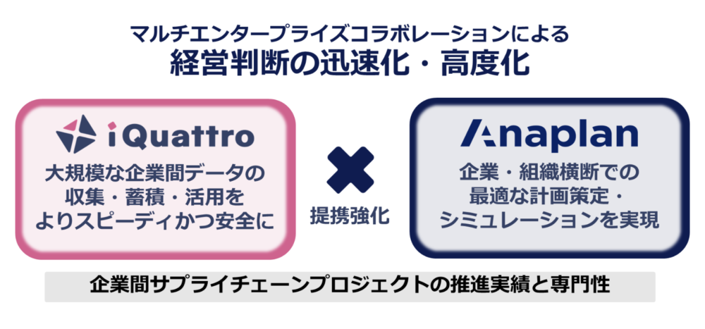 このたび、「Anaplan」と「iQuattro」の連携により、お客さまの持続可能なサプライチェーンの実現に寄与すると判断し、企業・拠点間における情報・計画連携領域での連携を強化しました。今後、両社ではプロジェクト推進・技術面での連携による共同でのサービス強化を行い、それに伴う、人材育成や販売強化を推進していきます。